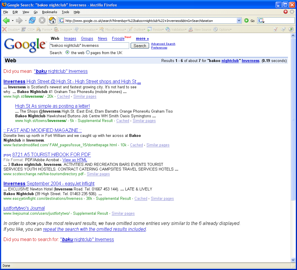 * True on 17 April 2008 but always subject to change (on 10 Sep 07 "high st" was number one on Google, Yaho and Microsoft Live search. On 3 March 2006 we were 1st on Yahoo and MSN Search, 2nd on Altavista and 3rd on Google. On 19 April 2005 we became number 1 on Google). A typical search for a business in a town, such as: 'Bakoo nightclub Inverness' also yields excellent results in most cases.